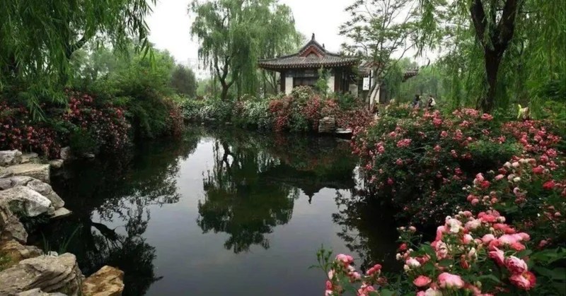 緑に生い茂る木々は地面に濃い影を落としており、夏の日は長い。高い建物の影が池の水に逆さまに映って見える。水晶でできた簾(すだれ)が動いてかすかな風がおこり、棚いっぱいのバラの香が、中庭全体に香っている。