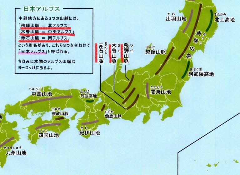 飛驒山脈とは、富山県・岐阜県・長野県・新潟県の4県にまたがる山脈である。木曽山脈とは、長野県に存在する山脈である。赤石山脈とは、長野県・山梨県・静岡県の3県にまたがる山脈である。中部地方にある、上記の3つの山脈を総称して「日本アルプス」という。
