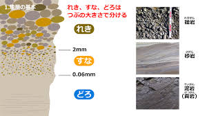 れきは粒が最も大きいため、河口付近(a)に推積する。泥は粒が最も小さいため、沖(c)まで運ばれたあとに推積する。