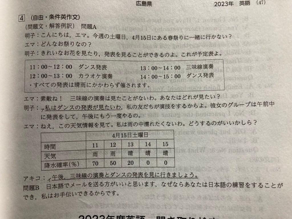 では、2023年広島県公立高校入試の過去問の英語を「かいせつ」していきます。