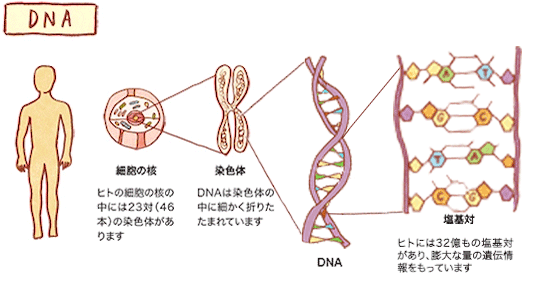 遺伝子の本体はDNA(デオキシリボ核酸)とよばれる物質である。