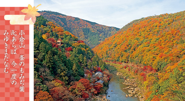 宇多法皇のお供で太政大臣(藤原忠平)が、大井川においでになったときに紅葉が小倉山に、さまざまな色合いで(映えているのが)たいそう美しかったのをこのうえなく感嘆なさって、
