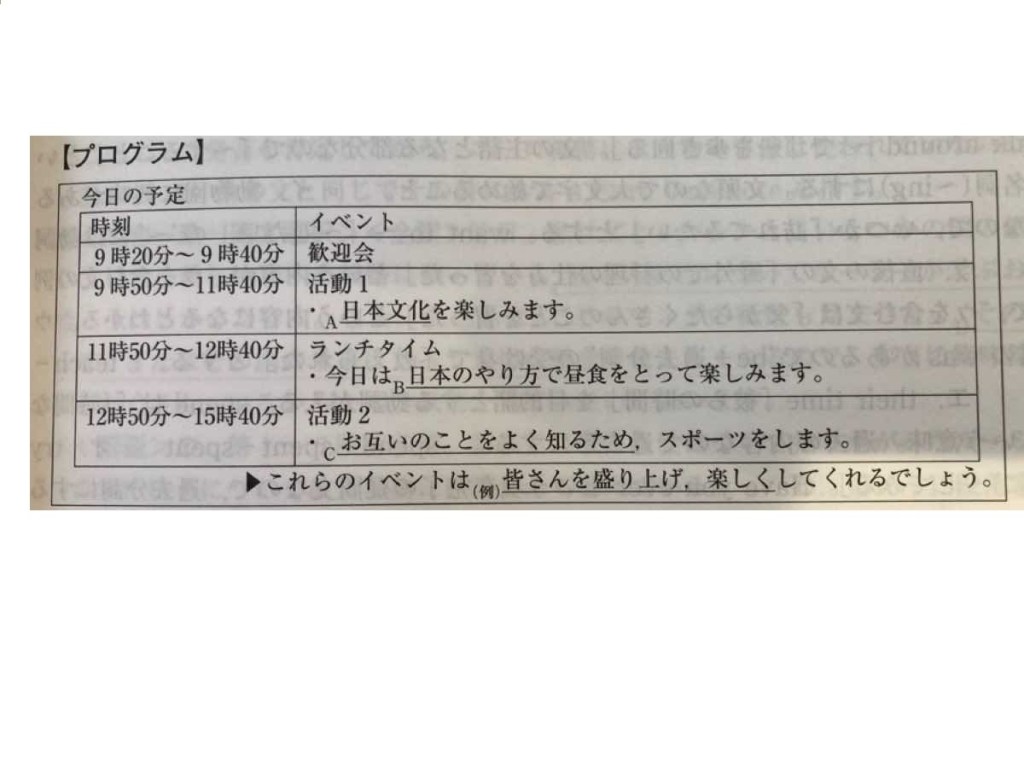 はじめまして。僕はケンジです。ミナミ中学校にようこそ。今日の予定を見てください。
