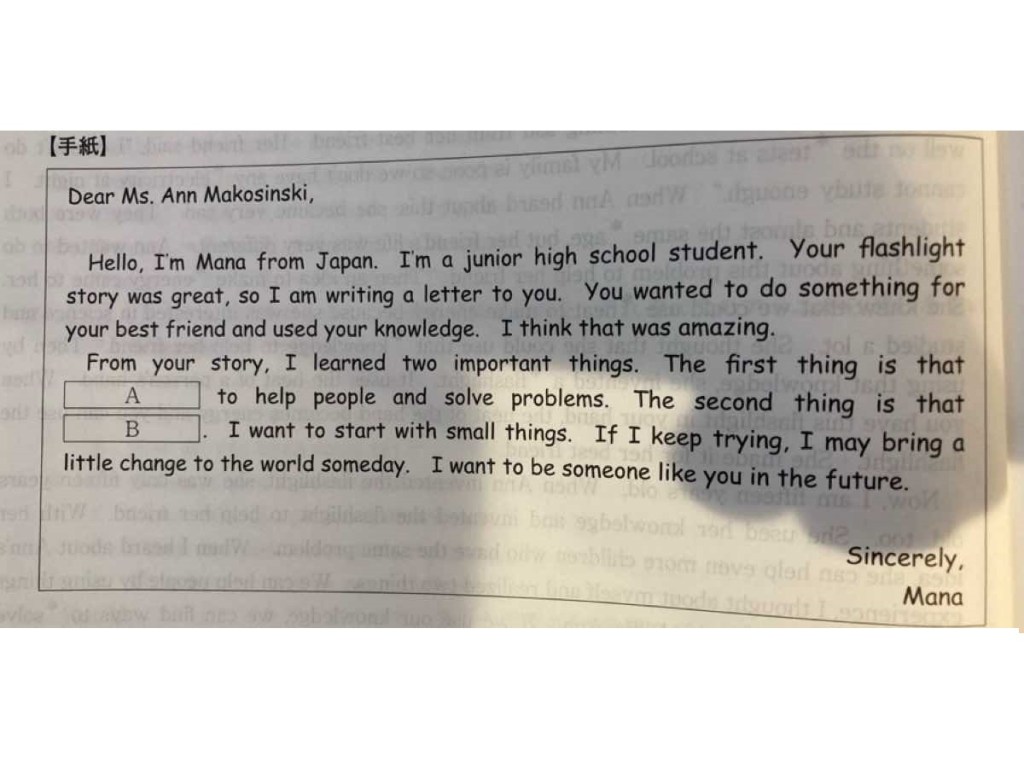 こんにちは、私は日本のマナといいます。私は中学生です。あなたの懐中電灯のお話がすばらしかったので、あなたにお手紙を書いています。あなたは親友のために何かしたいと思い、ご自分の知識を使ったのですね。それはすばらしいことだと思います。あなたのお話から、私は2つの大切なことを学びました。