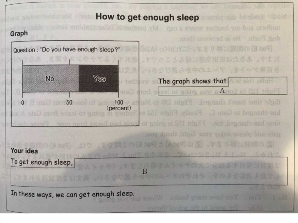 グラフからは、十分な睡眠をとっているかという質問に対して「いいえ」と答えた生徒が半分以上を占めていることがわかる。これを英語で説明する。接続詞 that に続く部分なので”主語+動詞…の形にすること。more than~「~より多くの」