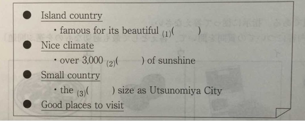 ALT:わかりました。私の母国は島国です。美しい海で有名です。水泳を楽しめますよ!一年中過ごしやすい気候です。日差しがたっぷりです。年間の日照時間は3000時間以上です。すばらしい場所です。私の母国はとても小さな国です。どのくらいの広さかわかりますか? 宇都宮市と同じくらいの広さです。びっくりでしょう?私の母国は小さいですが、すばらしい観光地がたくさんあります。私は母国が大好きです。ぜひ来てください!