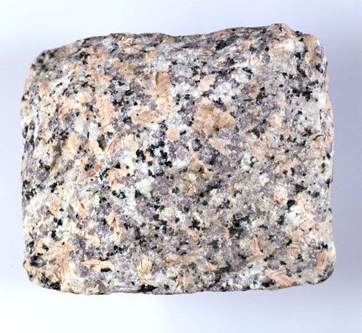 花こう岩は白っぽい色の火成岩で、無色鉱物のチョウ石が最も多く含まれる。なお、カンラン石・カクセン石・クロウンモは有色鉱物である。