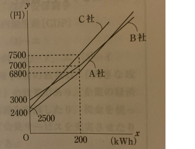 電気使用量が200kWhのとき、B社の電気料金は7000円、C社は7500円である。したがって、B社のグラフは点(200, 7000)を通り、C社のグラフは点(200, 7500)を通ることがわかる。
