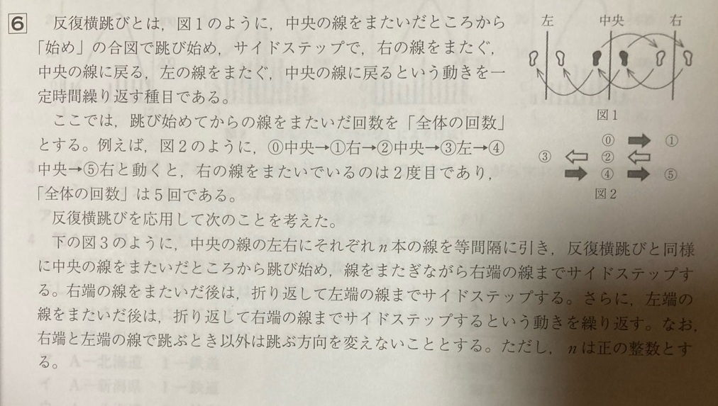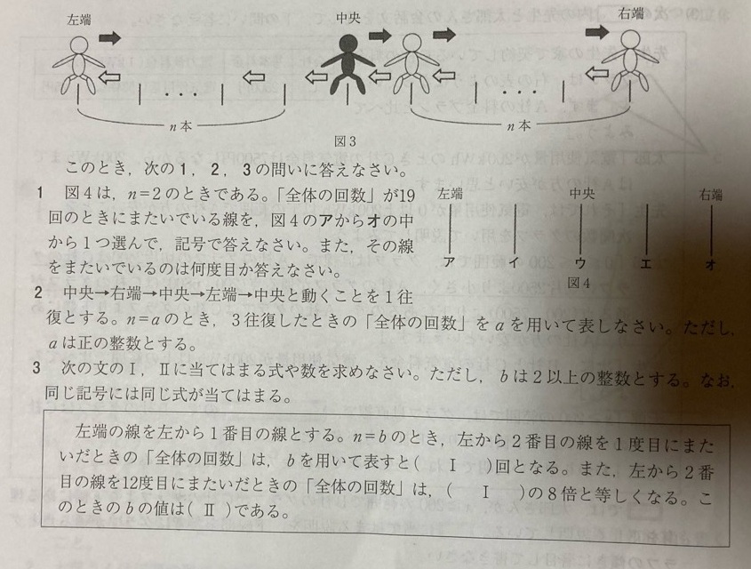 一方で、「左から2番目の線を1度目にまたいだときの回数」は、中央から右端(b回)、右端から中央(b回)、中央から左端(b−1回目でまたぐ)であるため、b+b+(b−1)=3b−1回である。これを1単位として8回繰り返すと、(3b−1)×8回=24b−8回。