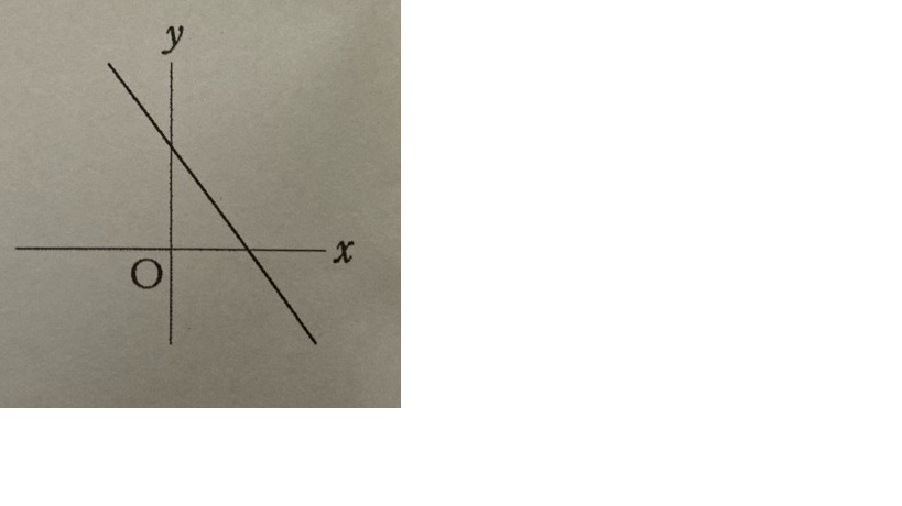 図のグラフは直線で、点O(原点)を通っていない。傾きa、切片bの符号について答える問題。