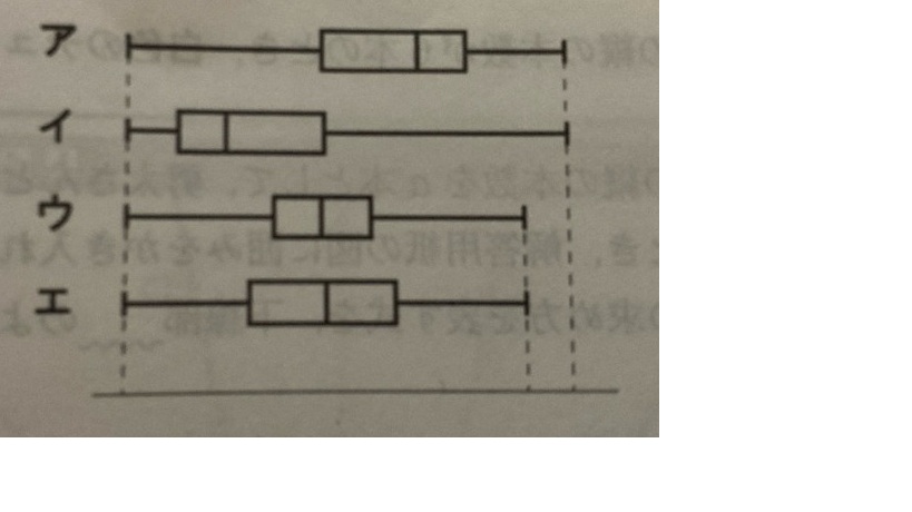 ⇒ 箱ひげ図「エ」(中央値がちょうど中央)