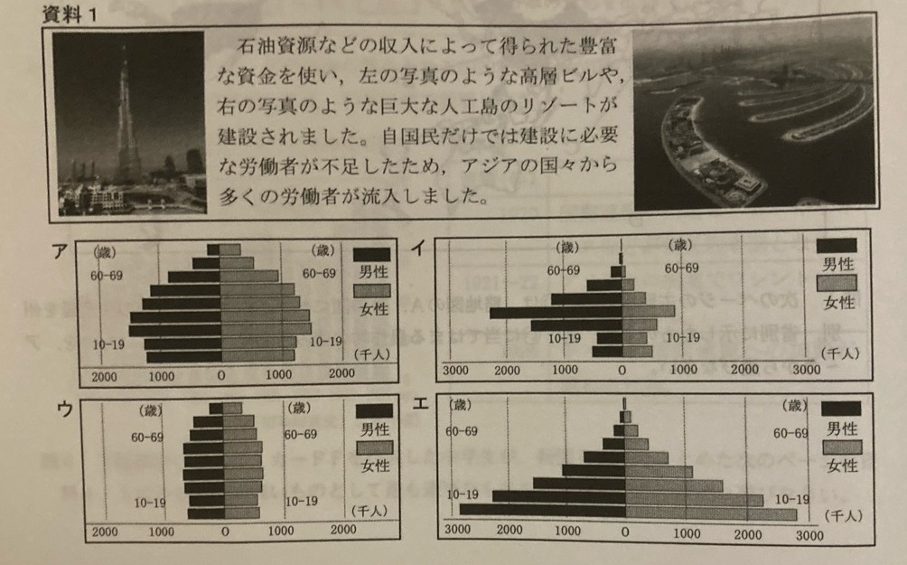 Cの国はアラブ首長国連邦であり、首都はアブダビである。最大の都市ドバイには、世界で一番高いタワーがある。人口ピラミッドは、流入した外国人男性労働者が多いため「イ」である。
