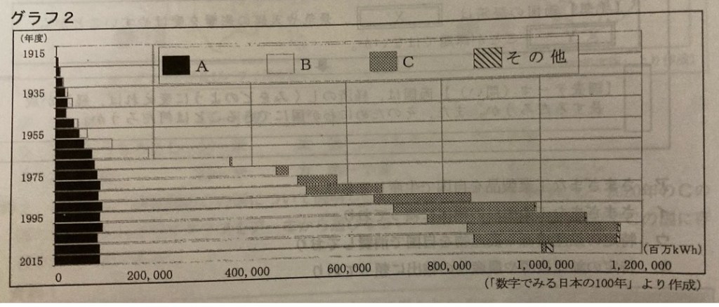 (2)火力発電所は、輸入の石油を燃料として利用するため、都市に近い臨海部に作られるのが特徴である。地図の「ウ」である。 - C(1)Cは、1975年から本格化した原子力発電である。