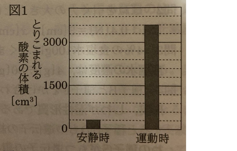 運動時の肺で1分間にとりこまれる酸素の体積は、安静時に比べて呼吸回数が3倍、1回の呼吸における吸う息の体積が2倍、肺でとりこまれる酸素の割合(%)が2倍になるため、肺で1分間にとりこまれる酸素の体積は、300[cm³]✕3✕2✕2=3600[cm³]であり、12メモリを棒グラフにする。