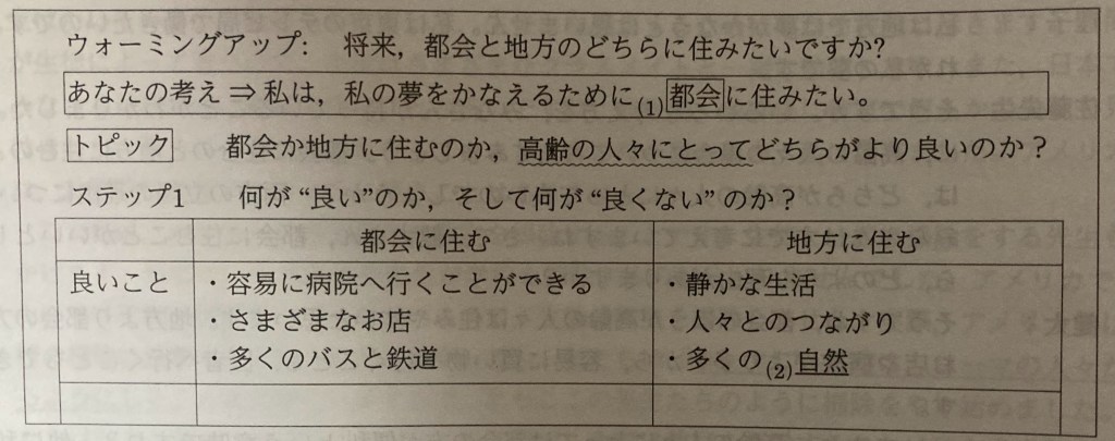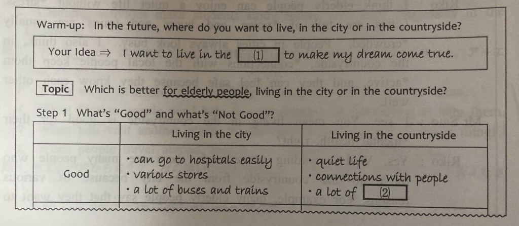 - 理子の発話 “Many elderly people want to live in a quiet place with a lot of nature.” から、「自然が多くある」→ nature