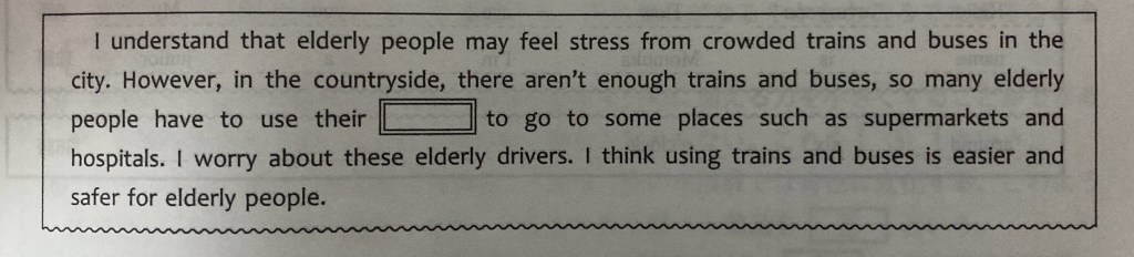 I understand that elderly people may feel stress from crowded trains and buses in the city. However, in the countryside, there aren’t enough trains and buses, so many elderly people have to use their ( ) to go to some places such as supermarkets and hospitals. I worry about these elderly drivers. I think using trains and buses is easier and safer for elderly people.