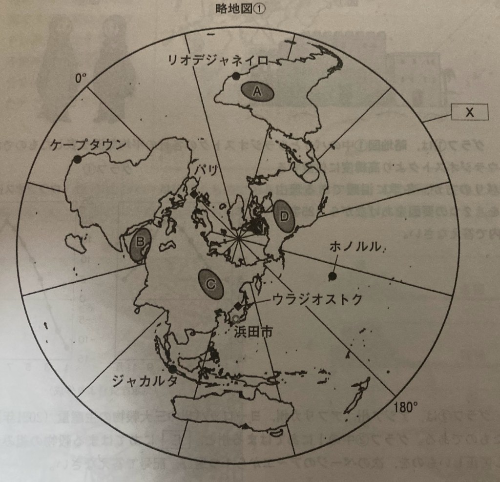 この地図は「正距方位図」であり、南半球の大陸も描かれているが南極大陸は含まれていない。したがって、ア(北緯60度)・イ(0度)・エ(南緯90度)は誤りで、正しいのはウ(南緯60度)。