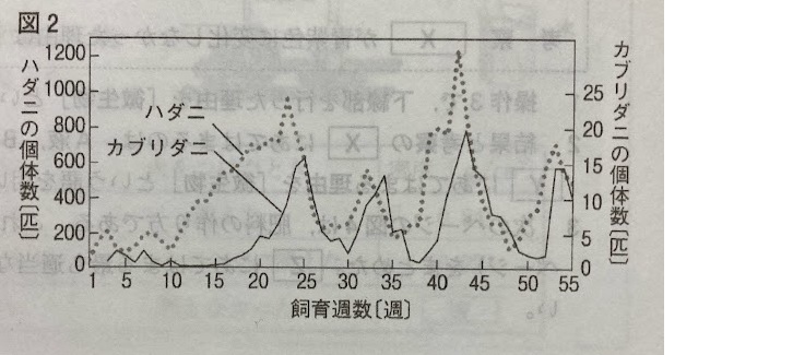 個体数の多いハダニが、個体数の少ないカブリダニに食べられている関係なども、「食べる−食べられる」の関係として図に表されている。