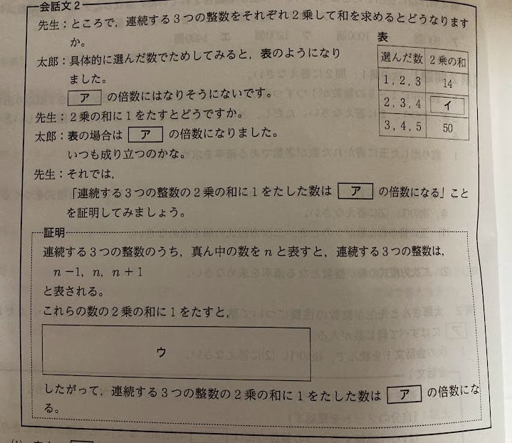 「連続する3つの整数の2乗の和に1をたした数はア(=3)の倍数になる」