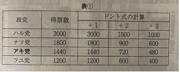 各党の得票を1,2,3…で割り、商の大きい順に定数分まで議席配分。