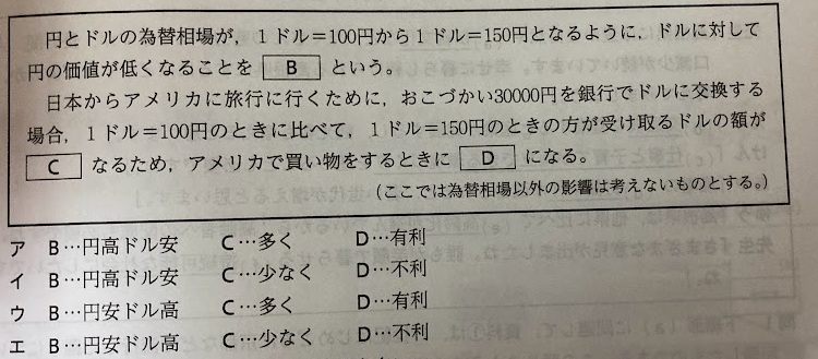 「1ドル100円→1ドル110円」は、同じ1ドルを買うのにより多く円が必要=円の価値が下がる。これを円安(ドル高)という。海外旅行は不利、輸出は有利など。