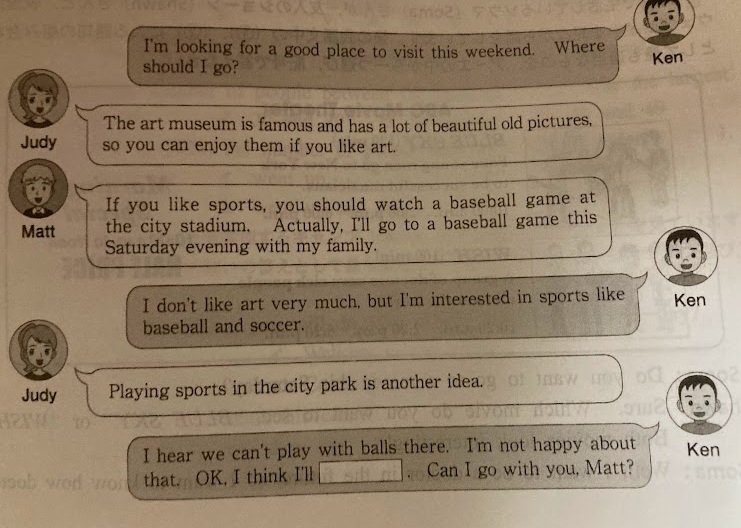 ケン:僕は芸術にはあまり興味がないけど、野球やサッカーみたいなスポーツには興味があるよ。