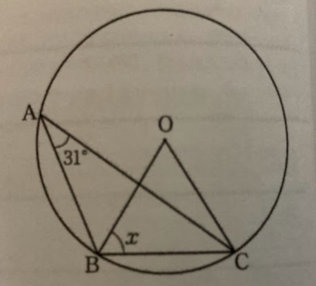 右の図で、3点A、B、Cは円の周上にあり、∠BAC = 31° である。