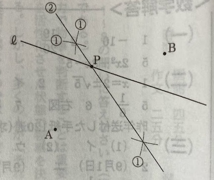 2点A、B から等しい距離にある直線 l 上の点Pを、作図によって求める。