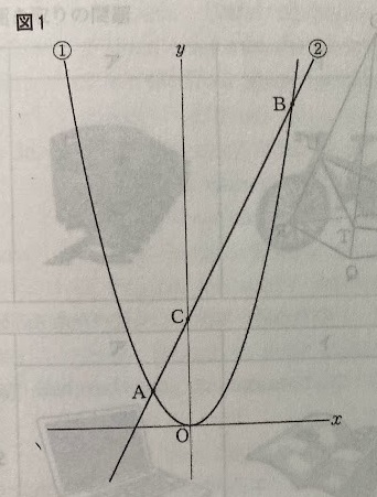 図1で、放物線①は y = a x^2 のグラフで、直線②は①上の2点 A、B を通る。
