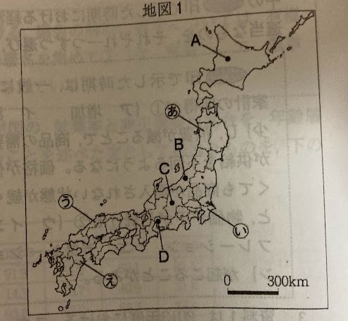 地図1中のあ~えの県の中には、県名と県庁所在地名が異なる県が一つある。それはどれか。あ~えから一つ選び、その記号と県名を書け。