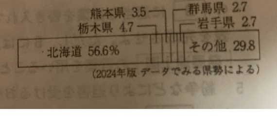 グラフでは、北海道が56.6%と圧倒的に多く、ほかに栃木県・熊本県・岩手県・群馬県などが続いている。