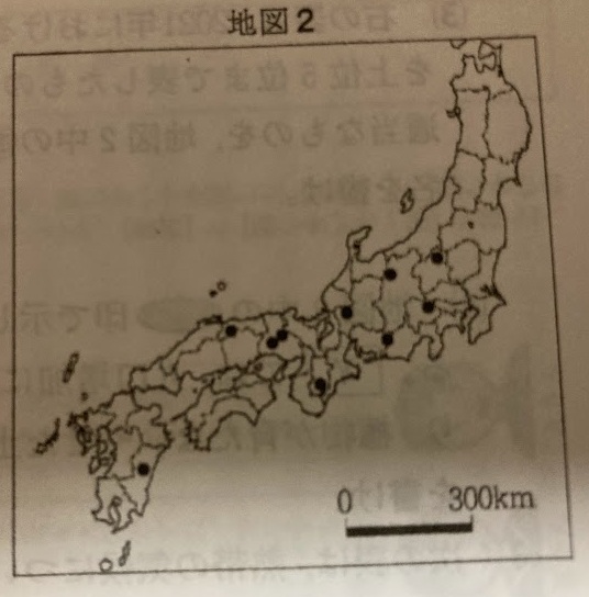 地図2中の●印は、2022年における、我が国の[ ]を上位10位まで取り上げ、その分布を表したものである。[ ]に当てはまる言葉として適当なものを、ア~エから一つ選び、その記号を書け。