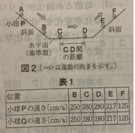 CD間は水平面なので、小球Pは一定の速さで動く。